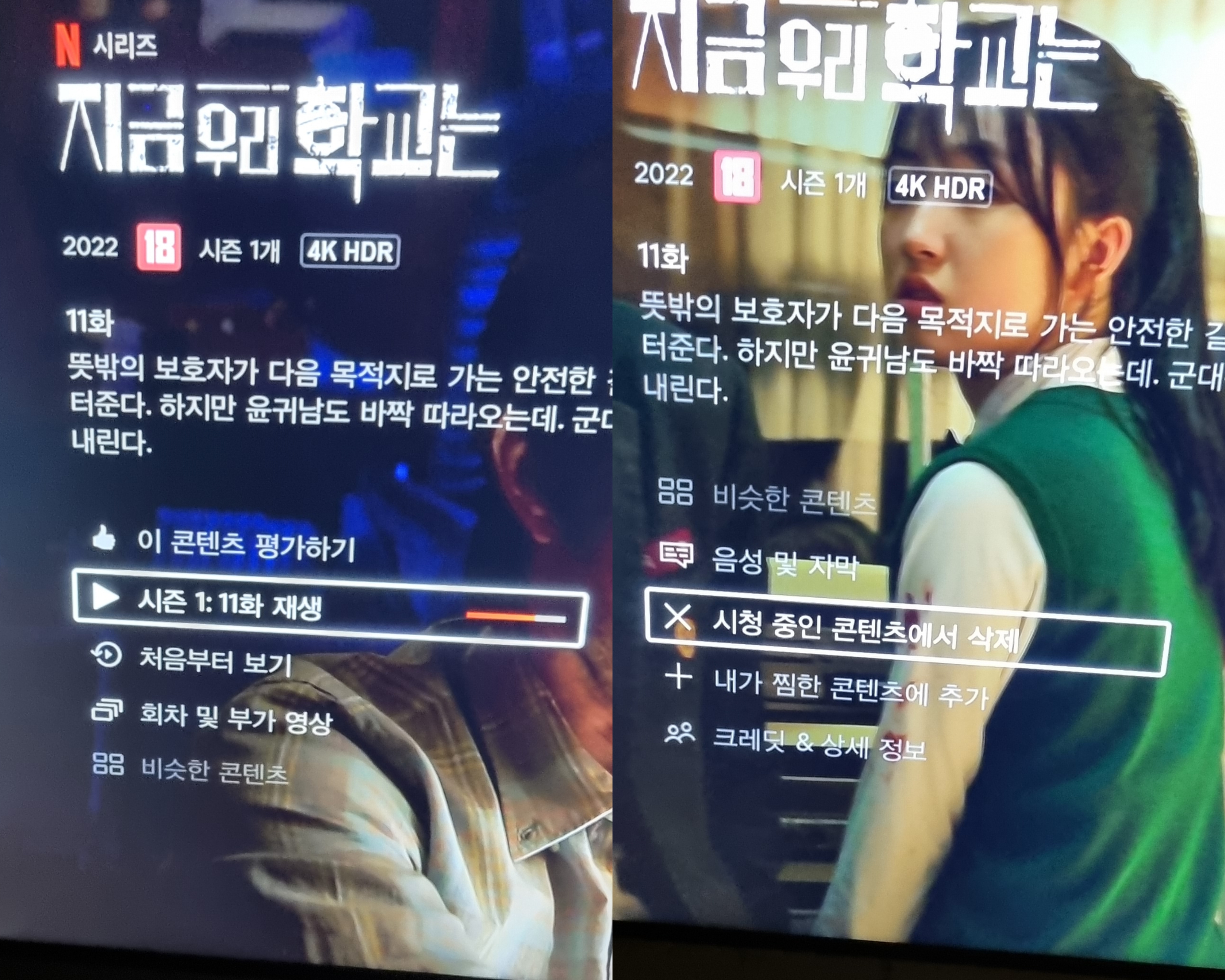 시청목록에서 해당 프로그램을 누르면 이렇게 나오는데 밑으로 계속 내리시면 시청중인 콘텐츠에서 삭제가 있습니다. 끝!