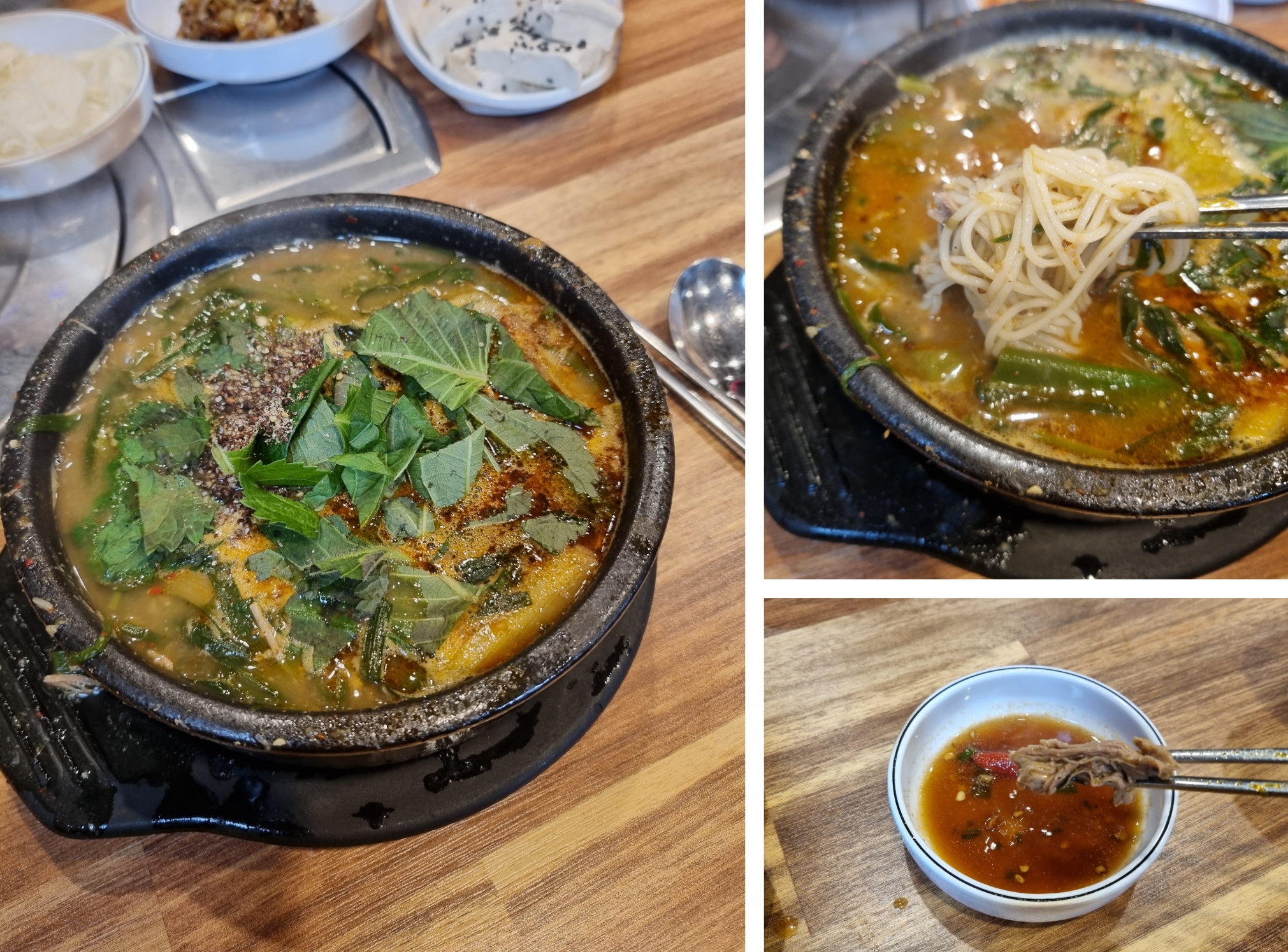 깻잎가득 올려진 오감탕 오리감자탕입니다. 이름에서 알수 있듯이 감자탕 느낌은 많이 나지만 오리의 그 깊은 맛은 국물에서 계속 나서 맛있습니다. 오리살도 퍽퍽하지 않고 부드러워서 평소 오리에 싫어하시는 분들도 잘 드실꺼 같습니다.