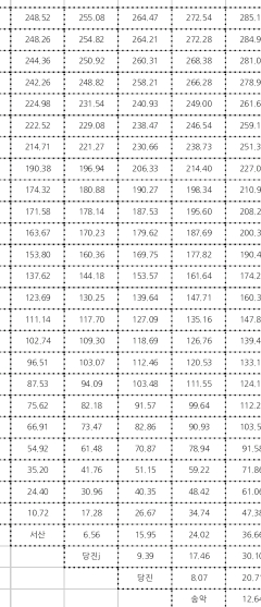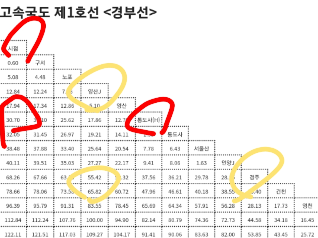 요런게 따로 공시 되어있습니다. 보시는 법은 시점 기준으로 아래로 내려가고 목적지 로 오른쪽 가면 우리가 도로에서 보는 숫자고.